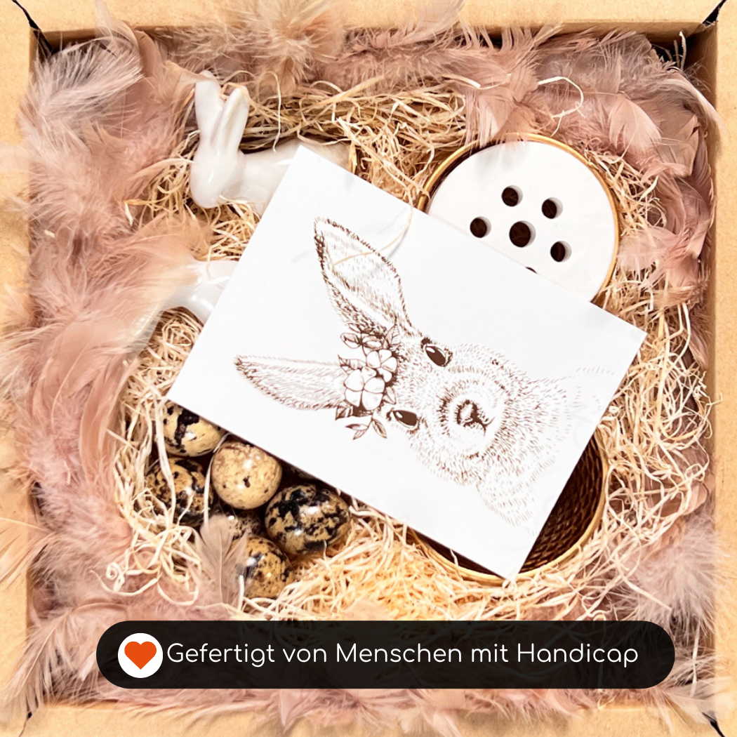 Die liebevolle Verpackung übernehmen Menschen mit Behinderung, die inklusiv bei Hey WOW Go Green beschäftigt sind. So unterstützt du mit jeder Box nicht nur die Osterfreude deiner Liebsten, sondern auch soziale Inklusionsprojekte.