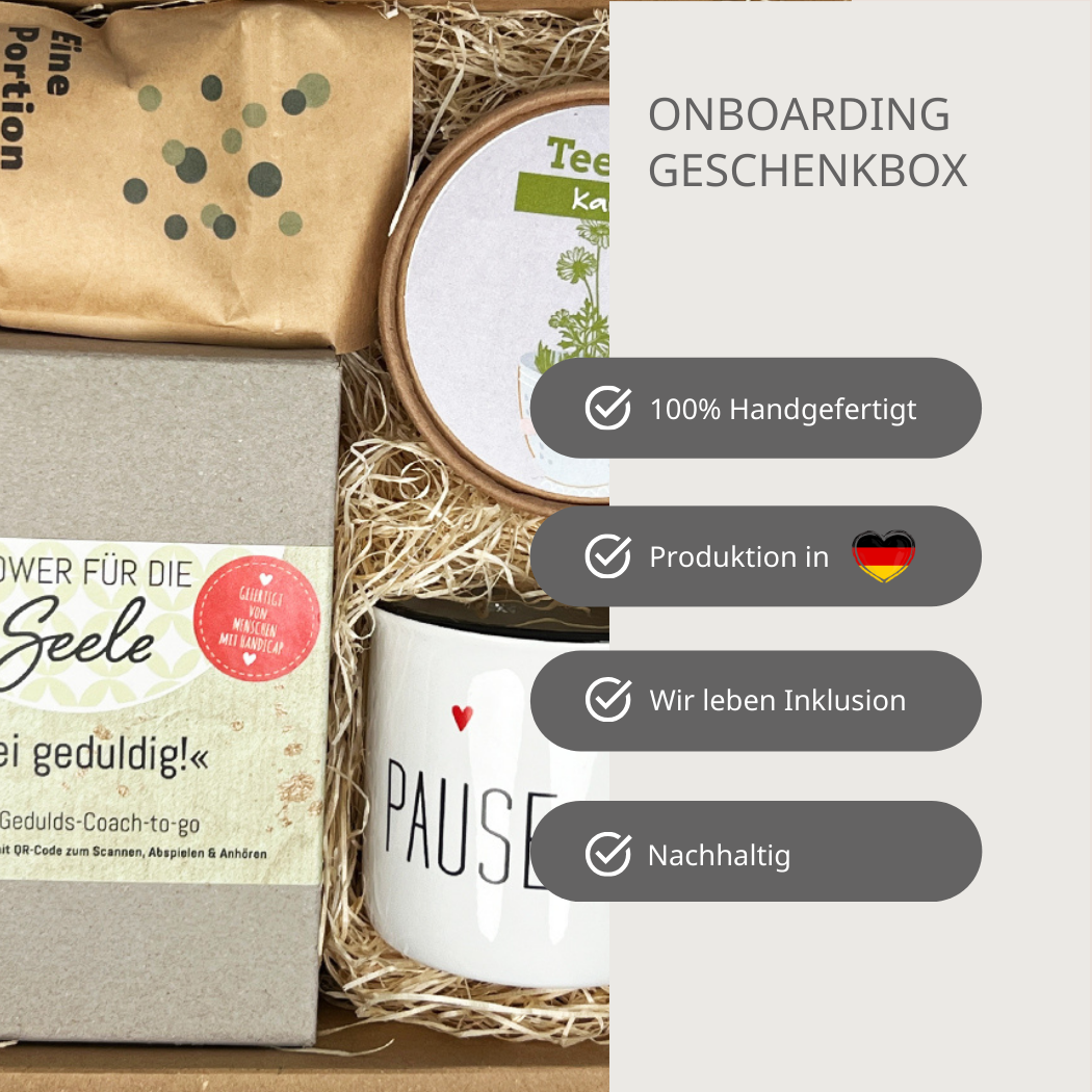 Mit unserer Onboarding Box, auch als Mitarbeiter-Willkommenspaket oder Corporate Welcome Kit bekannt, machst du den Einstieg von neuen Kolleg:innen oder Teammitgliedern zu etwas Besonderem. Ob zum Onboarding, als Geschenkbox fürs Team oder als Motivations-Box bei Projektstarts: hier verbindet sich Wertschätzung mit Kreativität, Genuss und innerer Kraft.