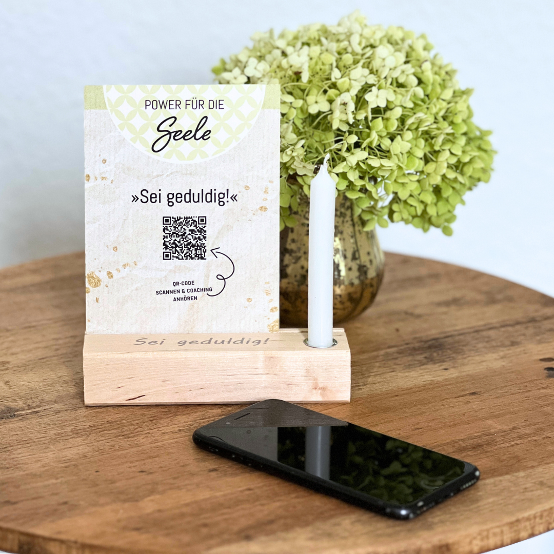 “Power für die Seele”-Coaching (QR-Code) Tee aufgießen, Coaching hören und motiviert in den Tag starten.