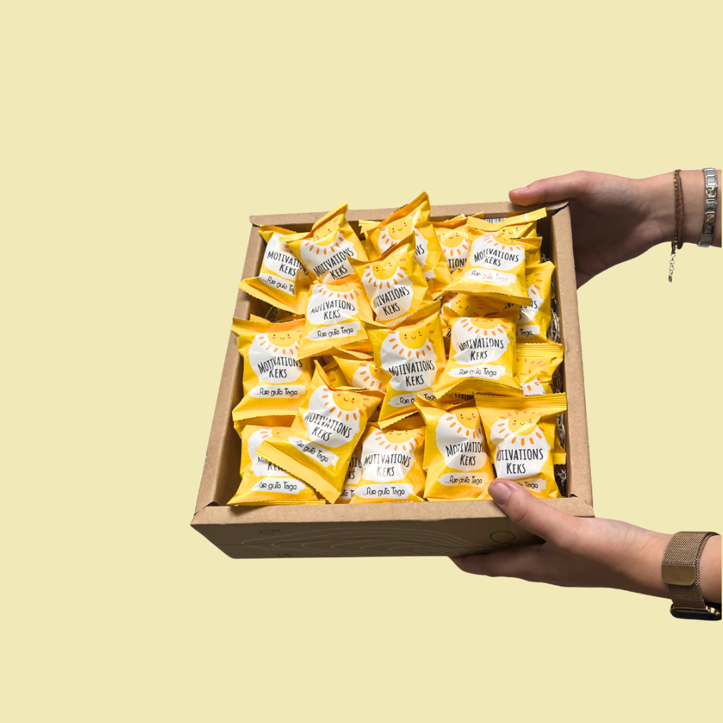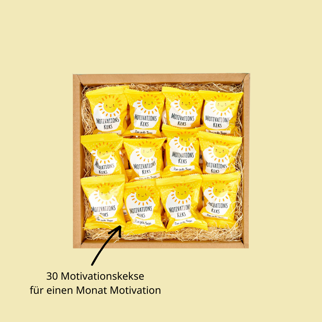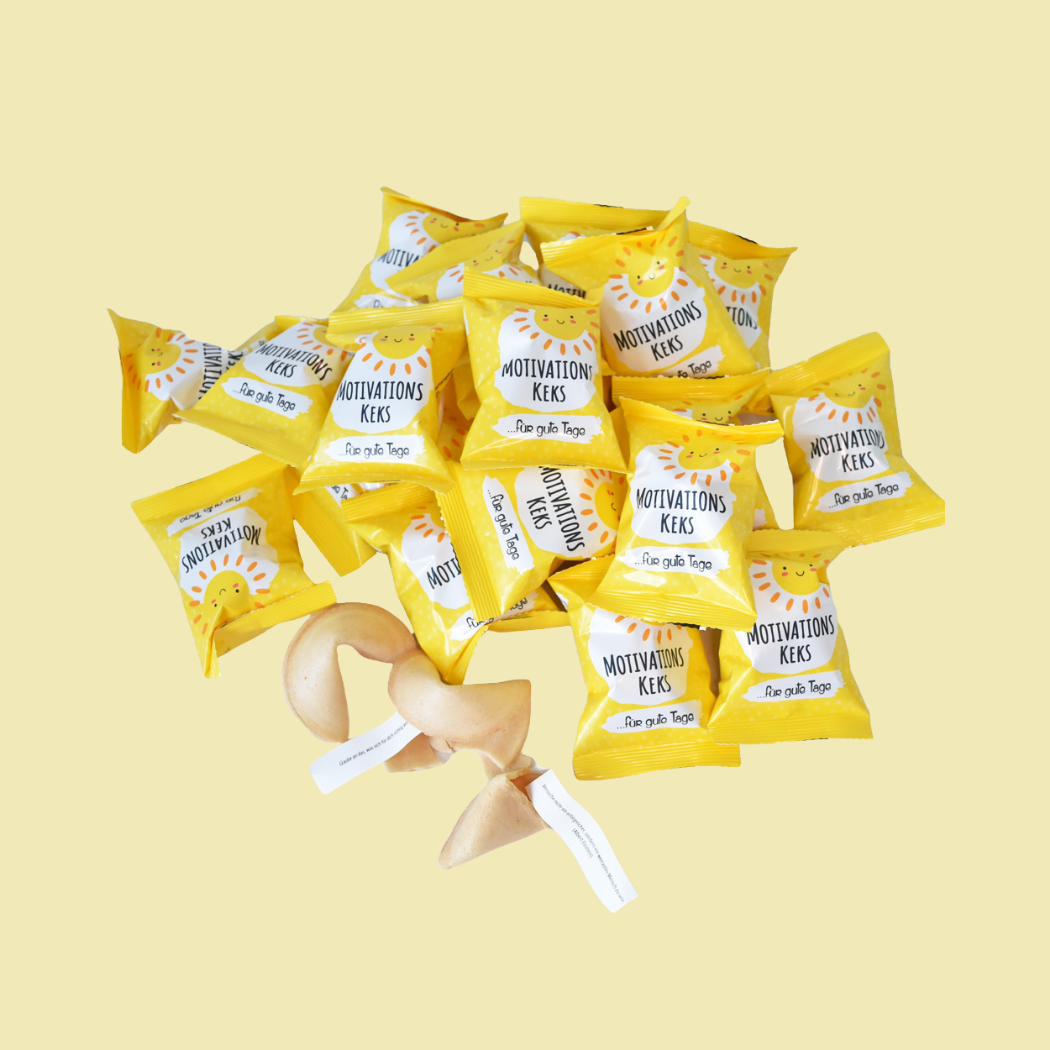 - 30 Glückskekse mit Vanillegeschmack – Jeder Keks enthält einen motivierenden Spruch für den Tag.