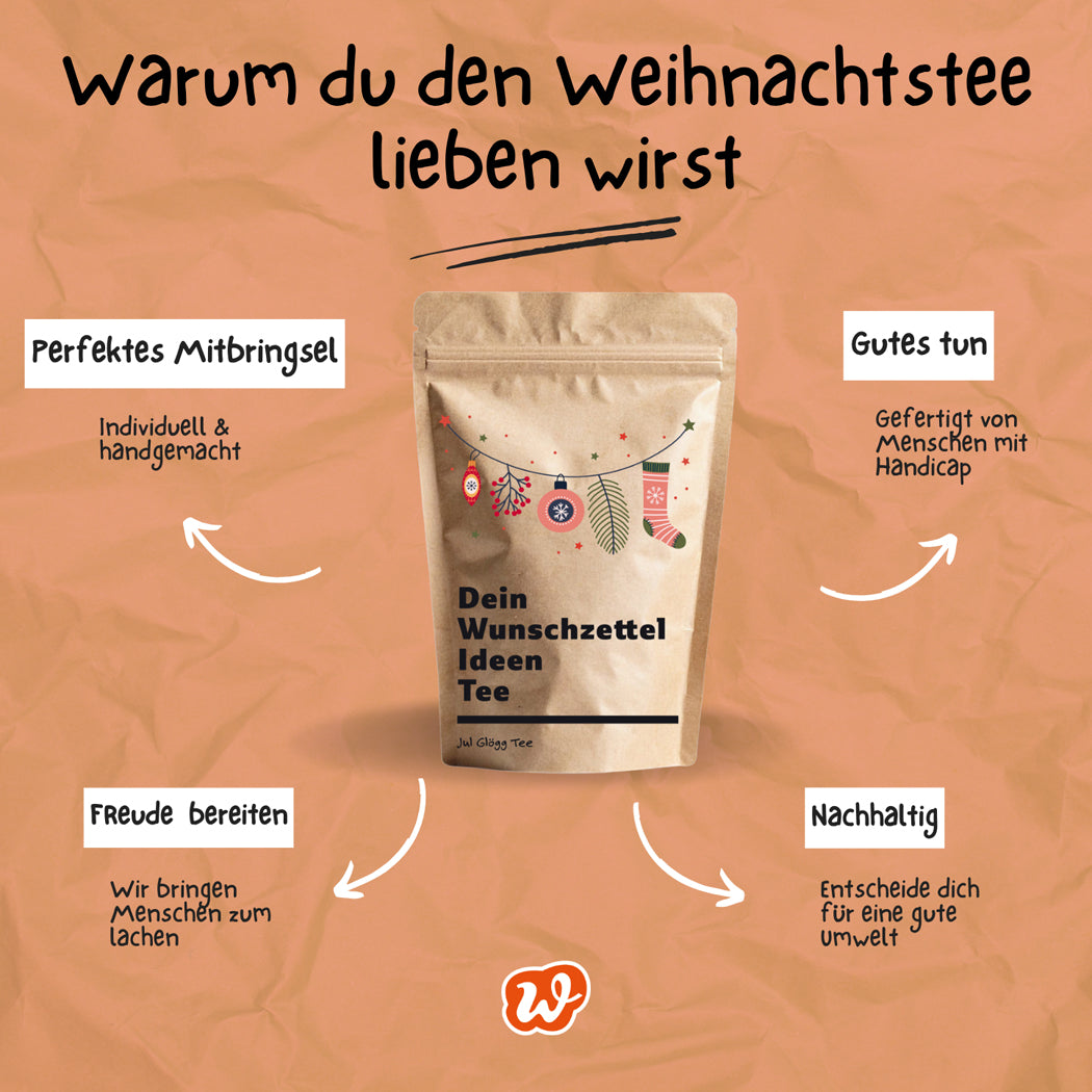 Unser „Wunschzettel-Ideen-Tee“ in der Sorte Jul Glögg, fruchtig, würzig, winterlich