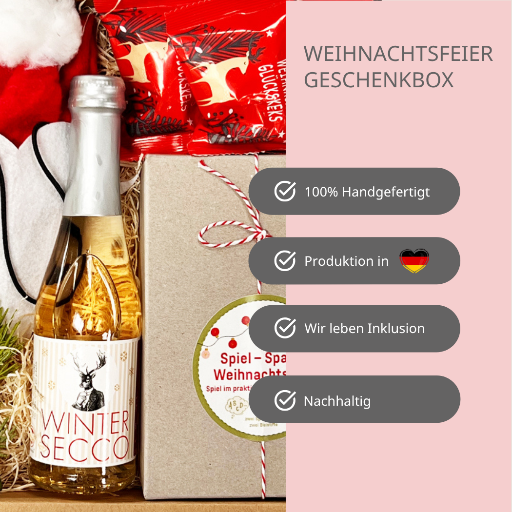 Unsere Weihnachtsfeier to go Geschenk Box ist die ideale Wahl, um für gute Laune und eine festliche Atmosphäre zu sorgen. Mit einer Mischung aus köstlichen Leckereien und spaßigen Accessoires wird deine Weihnachtsfeier garantiert ein voller Erfolg. Mach es dieses Jahr besonders und zeige deinem Team, wie sehr du sie schätzt. Bestelle jetzt und sorge für einen unvergesslichen Weihnachtsabend!