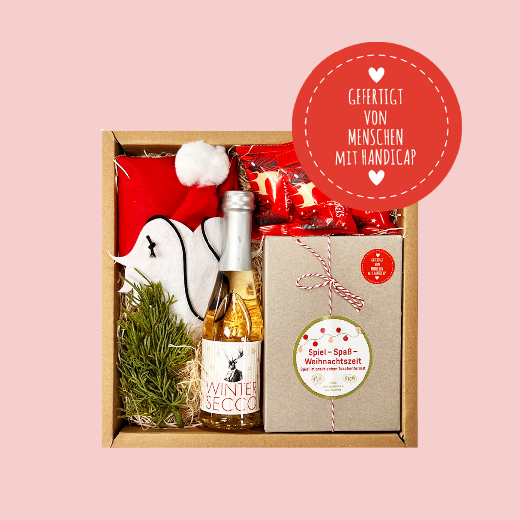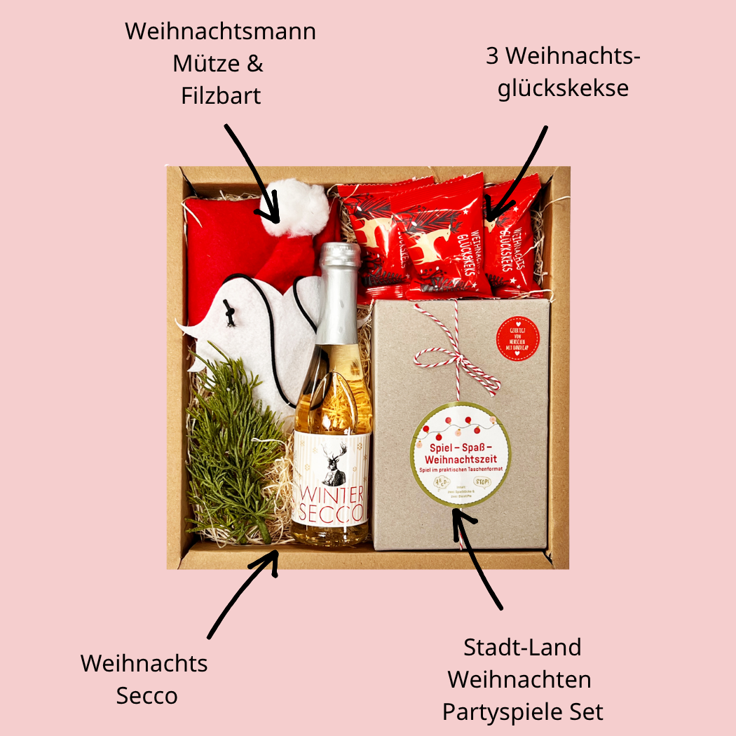 Du planst eine kleine Weihnachtsrunde oder suchst nach einer charmanten Alternative zur großen Betriebsfeier? Unsere Weihnachtsfeier to go Geschenkbox ist die perfekte Lösung! Sie steckt voller liebevoller Überraschungen, die sofort für festliche Stimmung, Lacher und Genuss sorgen, ganz ohne großen Aufwand.