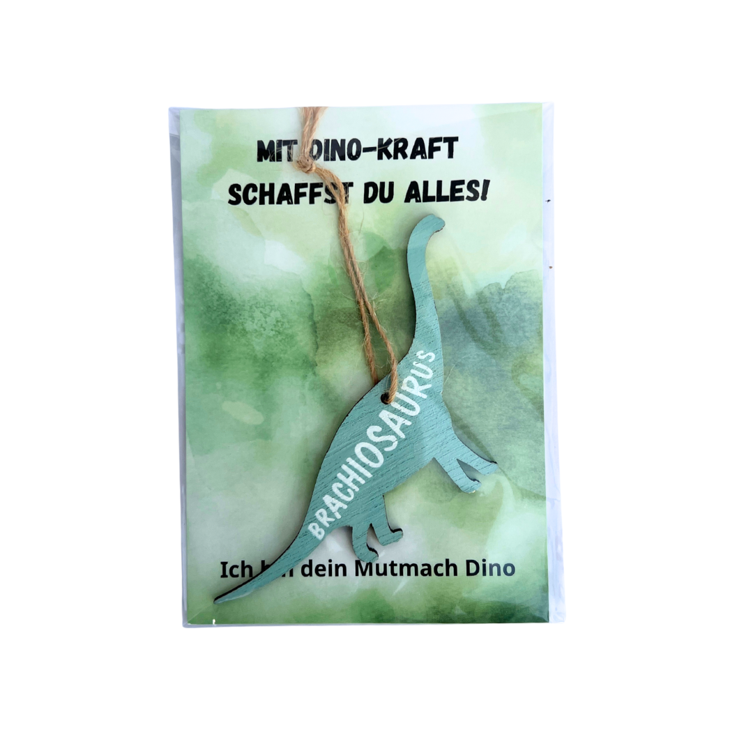 Dieses liebevoll gestaltete Set besteht aus einer Karte im Format 10,5 x 15 cm und einem hochwertigen Dino-Anhänger aus Holz. Der Dino ist mehr als nur ein Anhänger, er ist ein kleiner Mutbegleiter für jeden Tag.