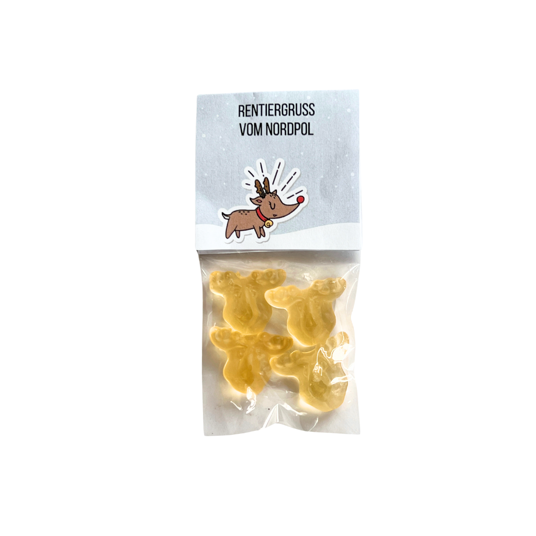 Kleinigkeiten für Adventskalender dürfen gerne ein bisschen Magie vom Nordpol mitbringen, findest du nicht? In dieser kleinen Tüte steckt pure Weihnachtsfreude: Fruchtgummi-Rentiere mit leckerem Eierpunsch-Geschmack, ganz ohne Alkohol, dafür mit jeder Menge Herz!