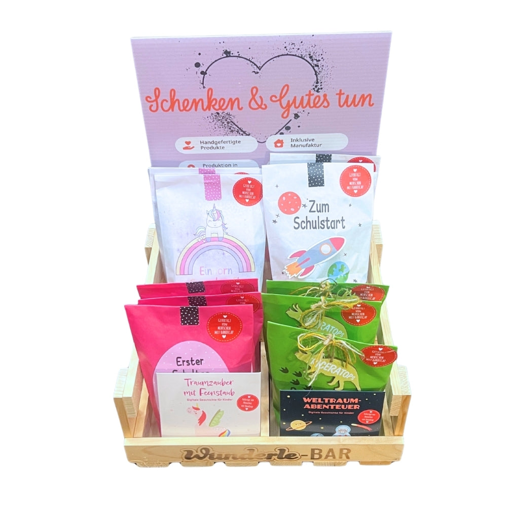 Das Display spricht genau die Kund:innen an, die „nur kurz schauen“ und mit einem liebevollen Schulanfangs-Geschenk wieder gehen. Eine gute Auswahl ohne Überforderung, perfekt für kleine und mittlere Verkaufsflächen.